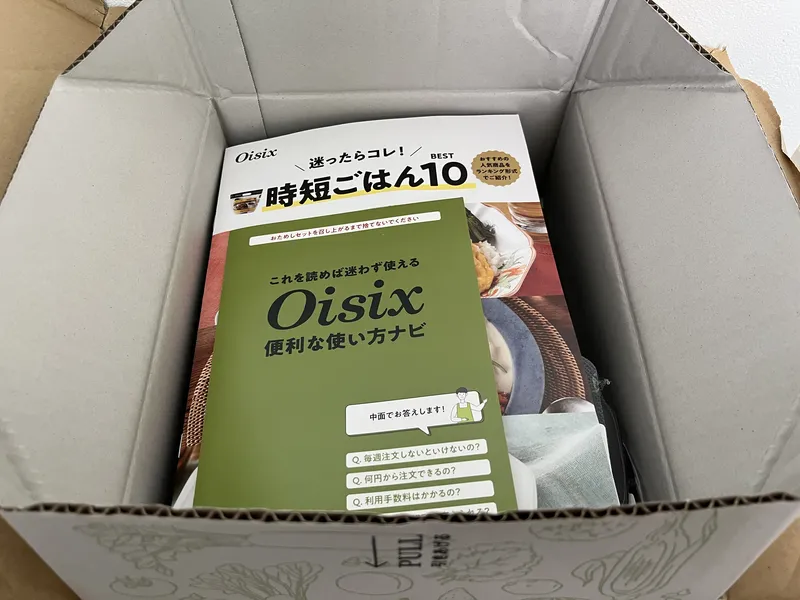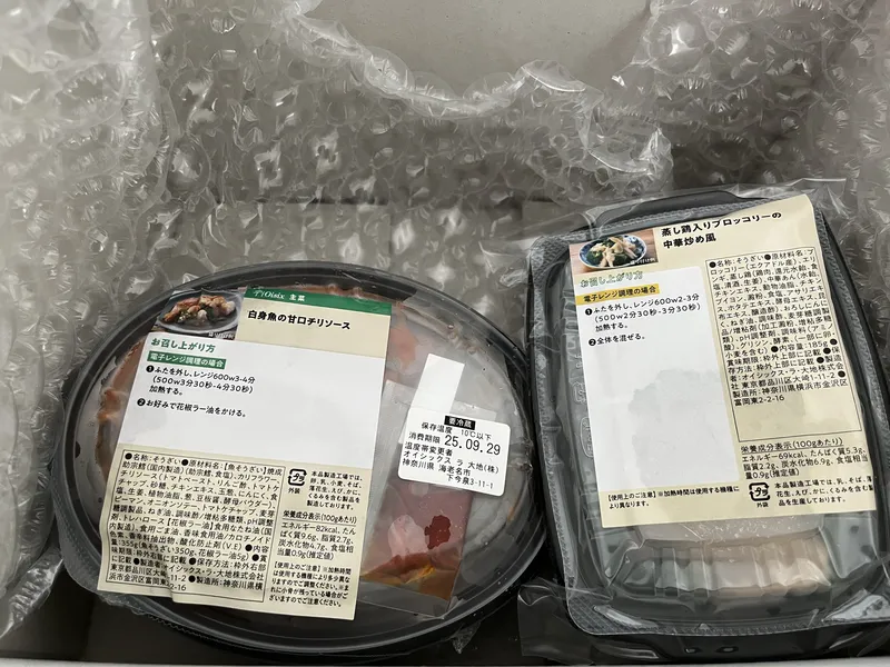 おためしセットはクール便で自宅に届きました。外箱には「Oisix」のロゴがあり、清潔感のある梱包で第一印象から安心感があります。開封すると、中には主菜・副菜2種類の3セットが入っており、ソースや調味料まで付いています。