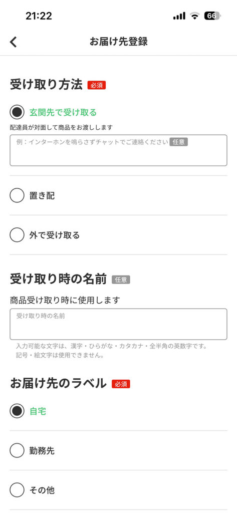 このアプリの登録で一番ミスが起きやすいのは、お届け先の設定です。