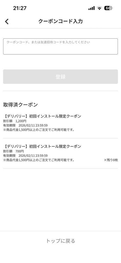 例えば「初回〇〇円オフ」と表示されていても、注文画面でクーポンを選択しないと割引されないケースがあります。